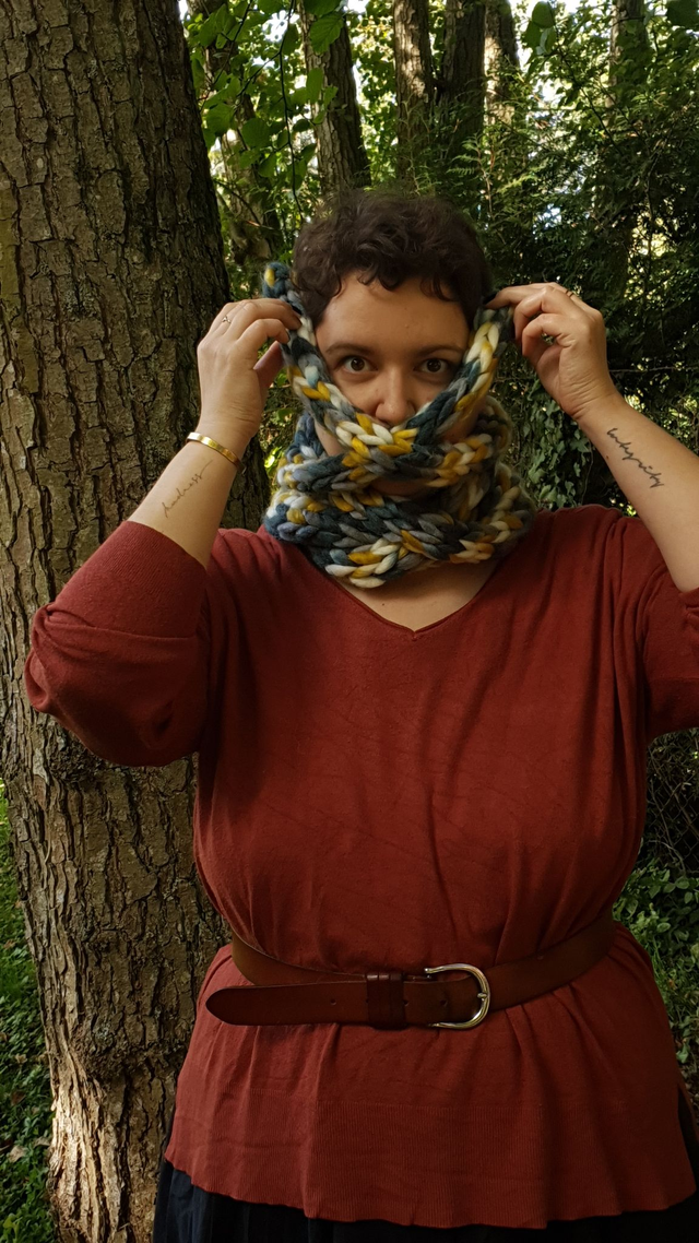 🧣 Cette écharpe est fine et légère. Elle se porte très facilement et prend de l'ampleur au fur et à mesure que vous l'enroulez autour de votre cou.