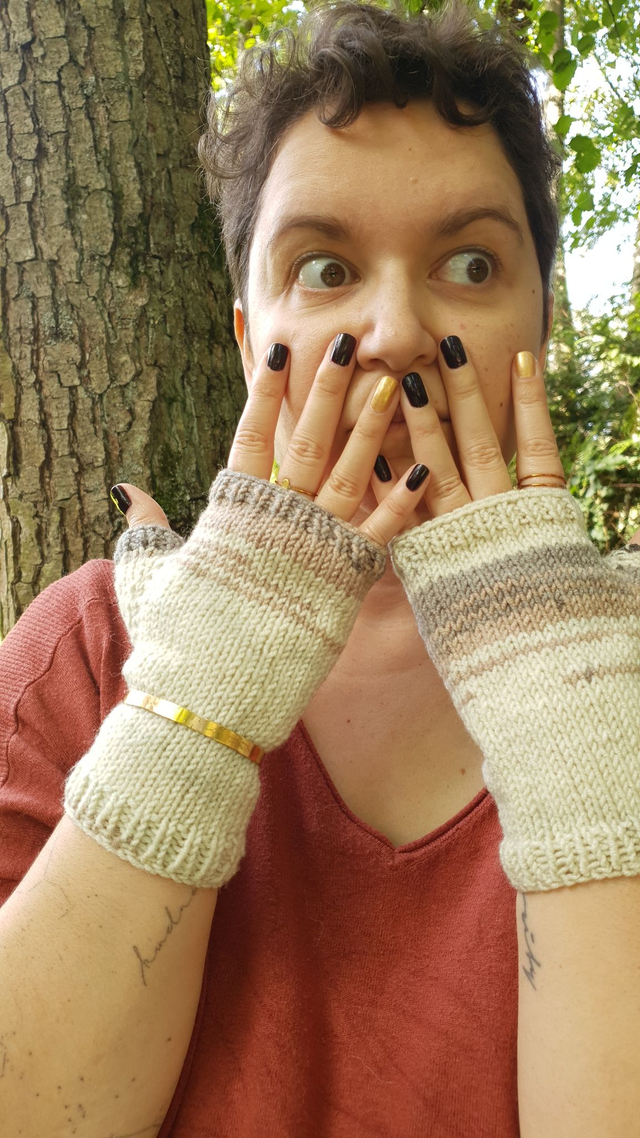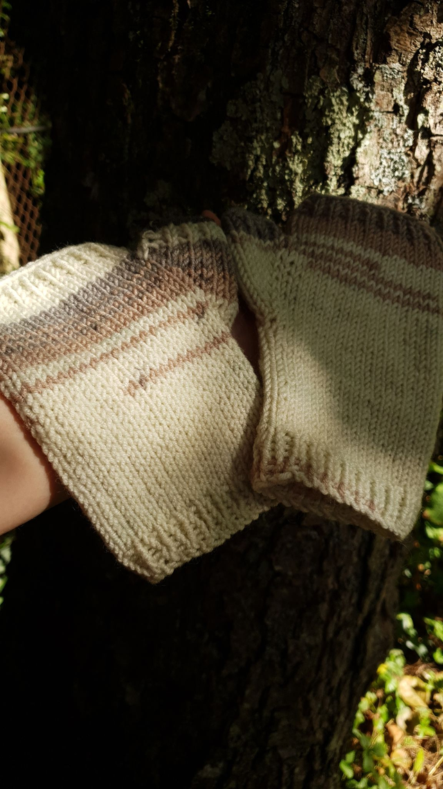 Ces mitaines sont larges et peuvent également convenir aux hommes. Elles sont tricotées dans un fil qui change de couleur. Couleurs : beige, crème, marron, gris foncé. Taille unique (Bracelet en laiton, présent sur la photo, non fourni)
